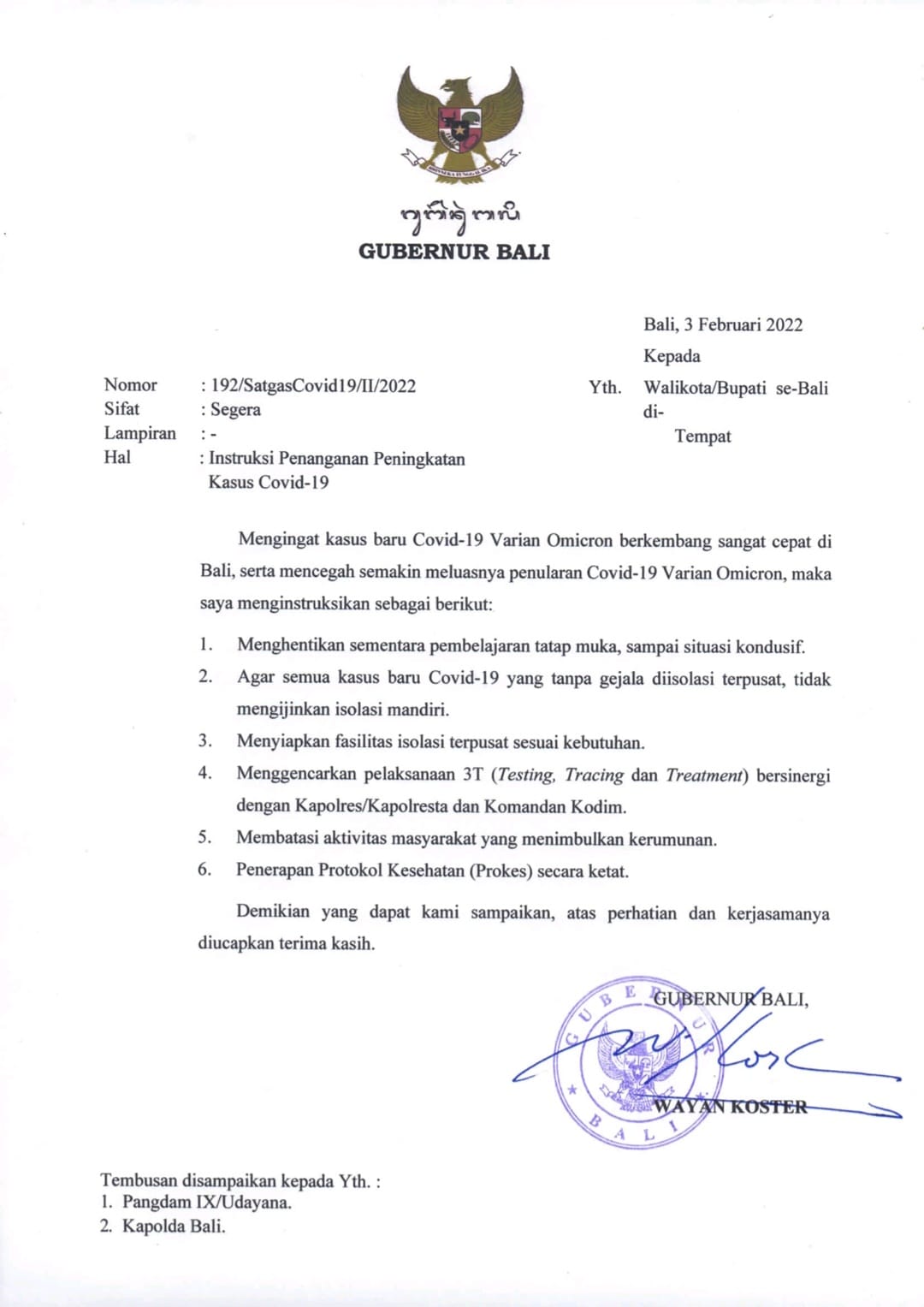 Instruksi Gubernur Bali No. 192/SatgasCovid19/II/2022 tentang Penanganan Peningkatan Kasus Covid-19. Mengingat kasus baru covid-19 varian omicron berkembang sangat cepat di Bali, serta dalam rangka mencegah semakin meluasnya penularan covid-19 varian omicron maka Gubernur Bali menginstruksikan sebagai berikut: